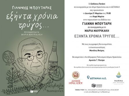 21/3/2022 Παρουσίαση του βιβλίου «60 Χρόνια Τρύγος» στο Ηράκλειο Κρήτης Παρουσίαση του βιβλίου 60 Χρόνια Τρύγος, θα πραγματοποιήσουν οι συγγραφείς Γιάννης Μπουτάρης και Μαρία Μαυρικάκη στο Ηράκλειο Κρήτης. Την εκδήλωση συνδιοργανώνουν οι εκδόσεις Πατάκη …